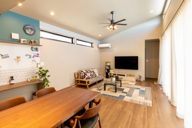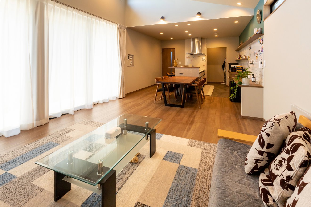 三昭堂 この空間の広がりがこのお住まいの特徴ですよね。S様 前面の道路からの視線や騒音が遮られているので、快適だと言ってみんな長居をしていきます。