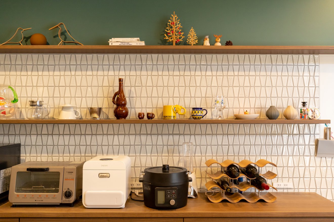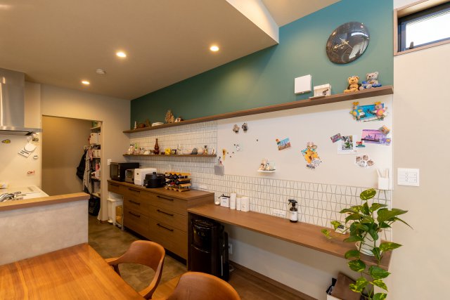 三昭堂 徹底的に仕上げましたね。あとキッチンも可愛いですね。S様 キッチンは毎日いるところなので妥協はしませんでした。例えば背面のタイル張りです。アクセントクロスと悩みましたが、見た目や質感を大切にて気に入ったタイルにしました。後悔はしたくないですから。
